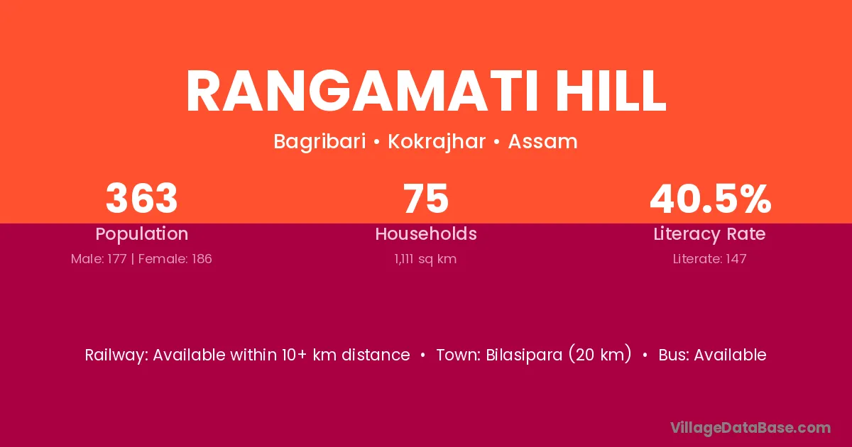 Bilasipara (20 km) is the nearest town to Rangamati Hill village for major economic activities and is located approximately 20 km away.