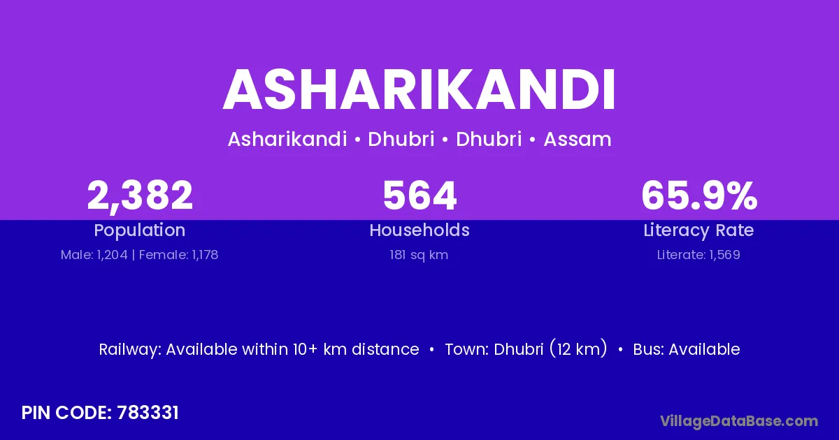 Gossaigaon (23 km) is the nearest town to Asharikandi village for major economic activities and is located approximately 23 km away.
