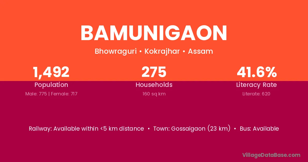 Bamunigaon village has a total population of 1,492 people, of which 775 are males and 717 are females.