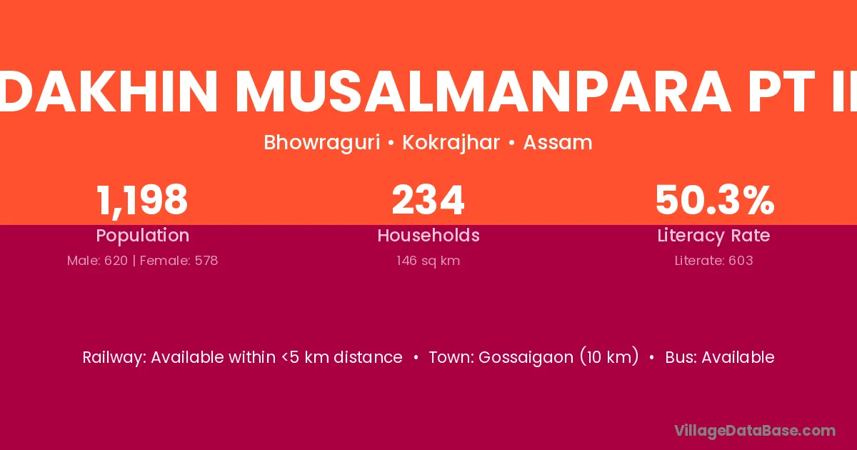 Dakhin Musalmanpara Pt Ii village has a total population of 1,198 people, of which 620 are males and 578 are females.