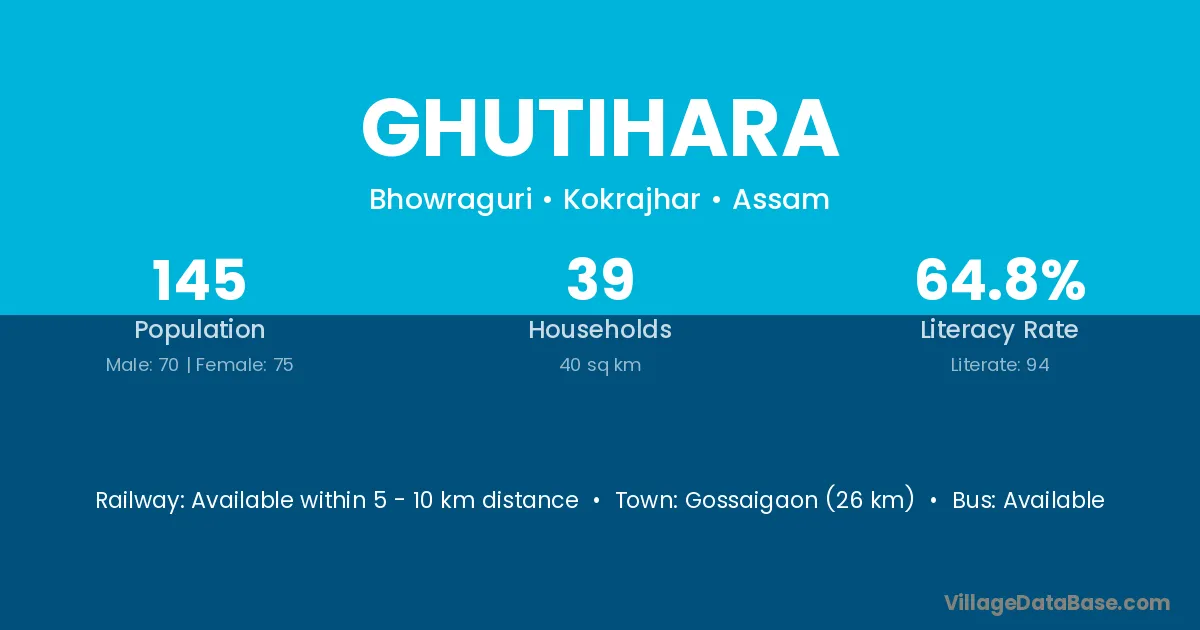 Gossaigaon (26 km) is the nearest town to Ghutihara village for major economic activities and is located approximately 26 km away.