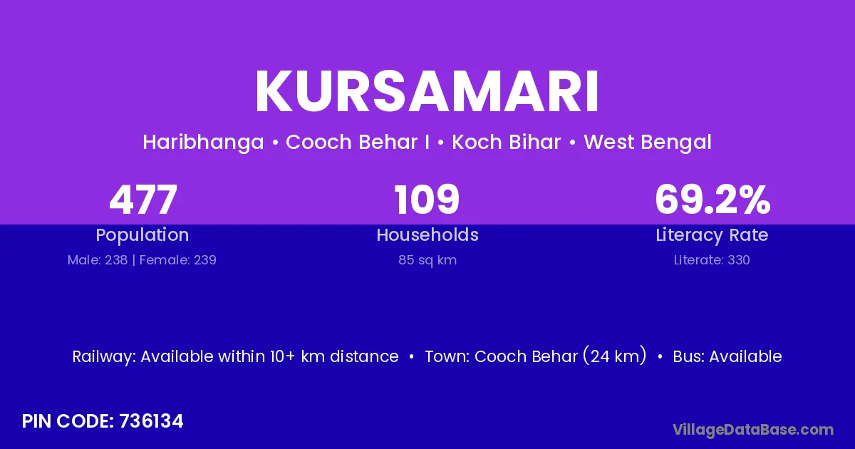 Gossaigaon (10 km) is the nearest town to Kursamari village for major economic activities and is located approximately 10 km away.
