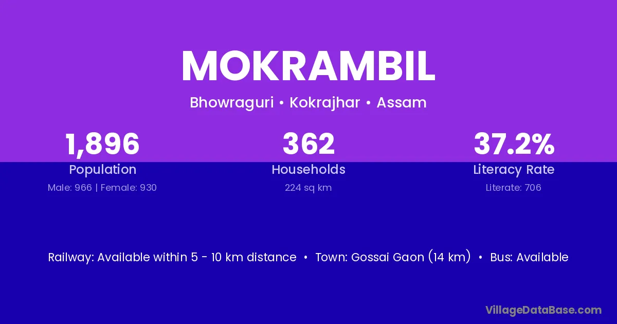 Gossai Gaon (14 km) is the nearest town to Mokrambil village for major economic activities and is located approximately 14 km away.
