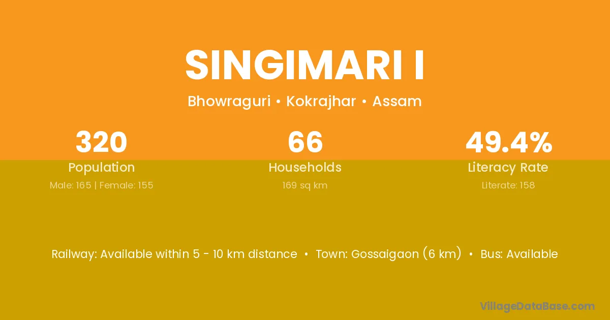 Gossaigaon (6 km) is the nearest town to Singimari I village for major economic activities and is located approximately 6 km away.