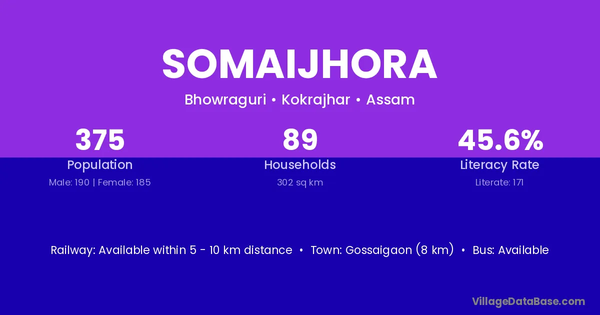Gossaigaon (8 km) is the nearest town to Somaijhora village for major economic activities and is located approximately 8 km away.