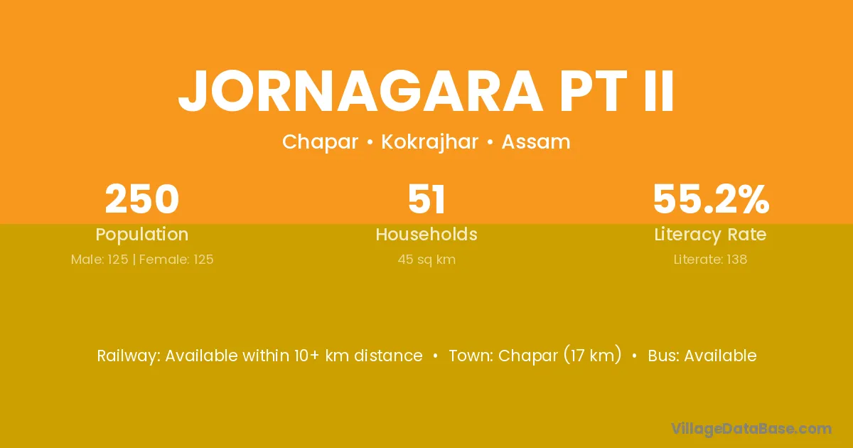 Chapar (17 km) is the nearest town to Jornagara Pt Ii village for major economic activities and is located approximately 17 km away.