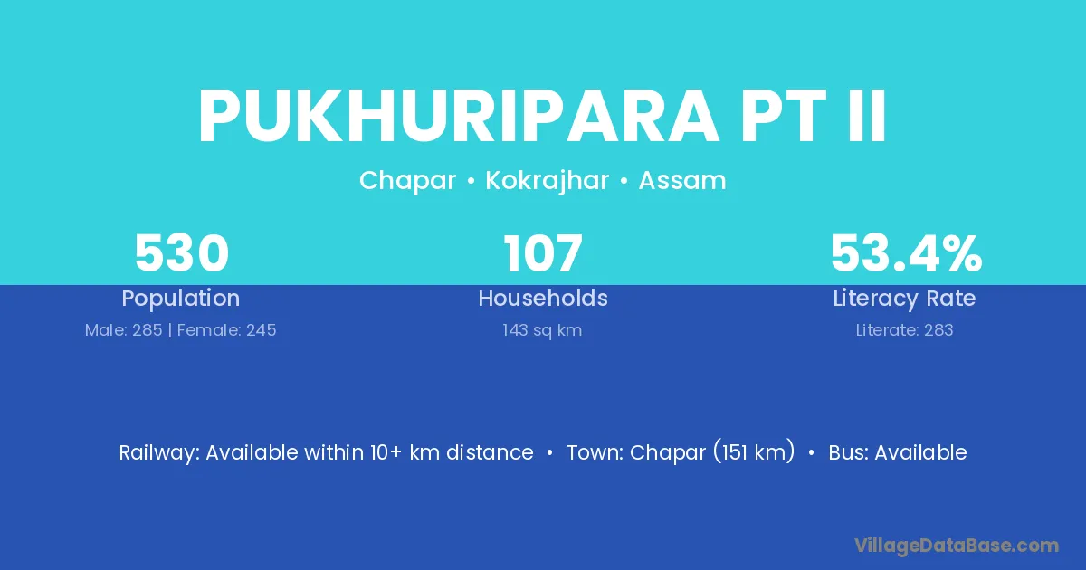 Pukhuripara Pt Ii village has a total population of 530 people, of which 285 are males and 245 are females.