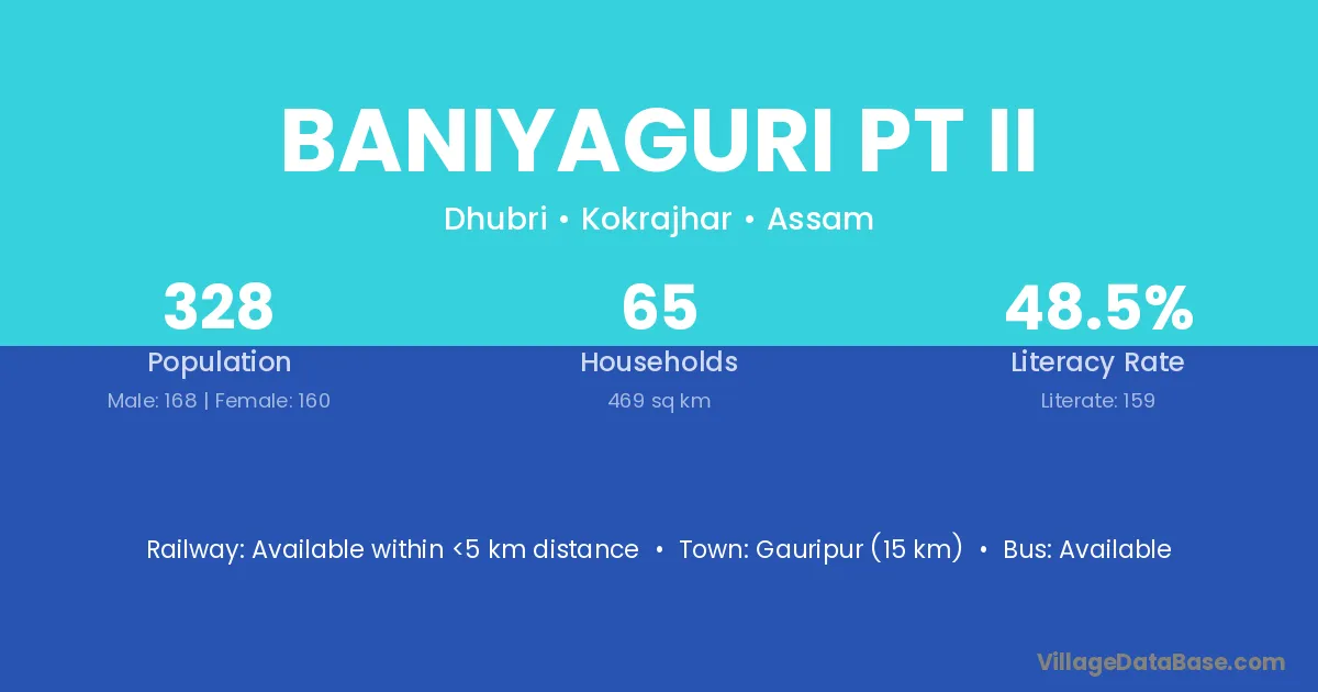 Baniyaguri Pt Ii village has a total population of 328 people, of which 168 are males and 160 are females.