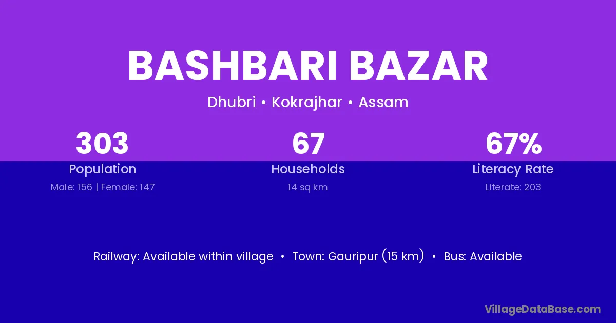 Bashbari Bazar village has a total population of 303 people, of which 156 are males and 147 are females.