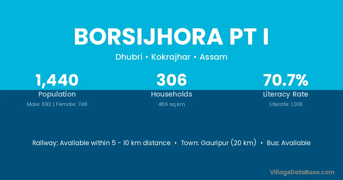 Gauripur (20 km) is the nearest town to Borsijhora Pt I village for major economic activities and is located approximately 20 km away.