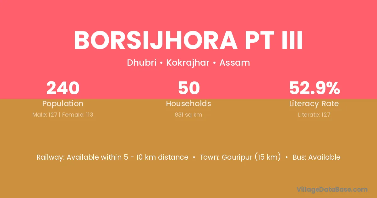 Gauripur (15 km) is the nearest town to Borsijhora Pt Iii village for major economic activities and is located approximately 15 km away.
