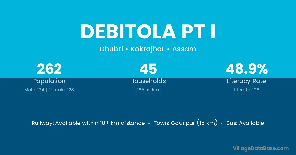 Gauripur (15 km) is the nearest town to Debitola Pt I village for major economic activities and is located approximately 15 km away.