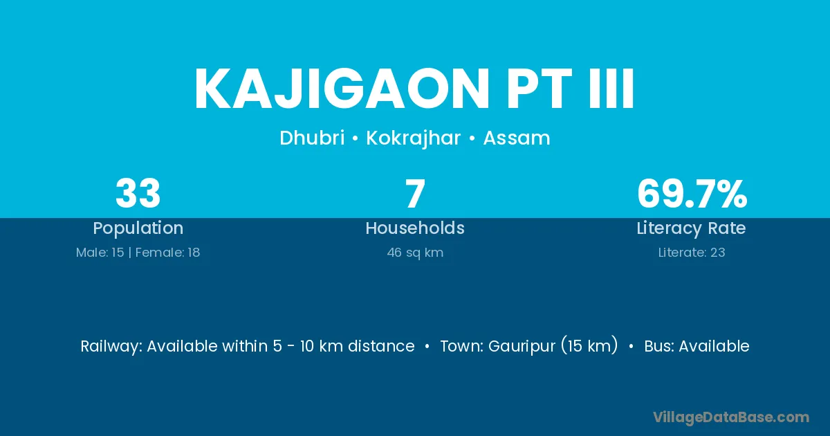 Gauripur (15 km) is the nearest town to Kajigaon Pt Iii village for major economic activities and is located approximately 15 km away.