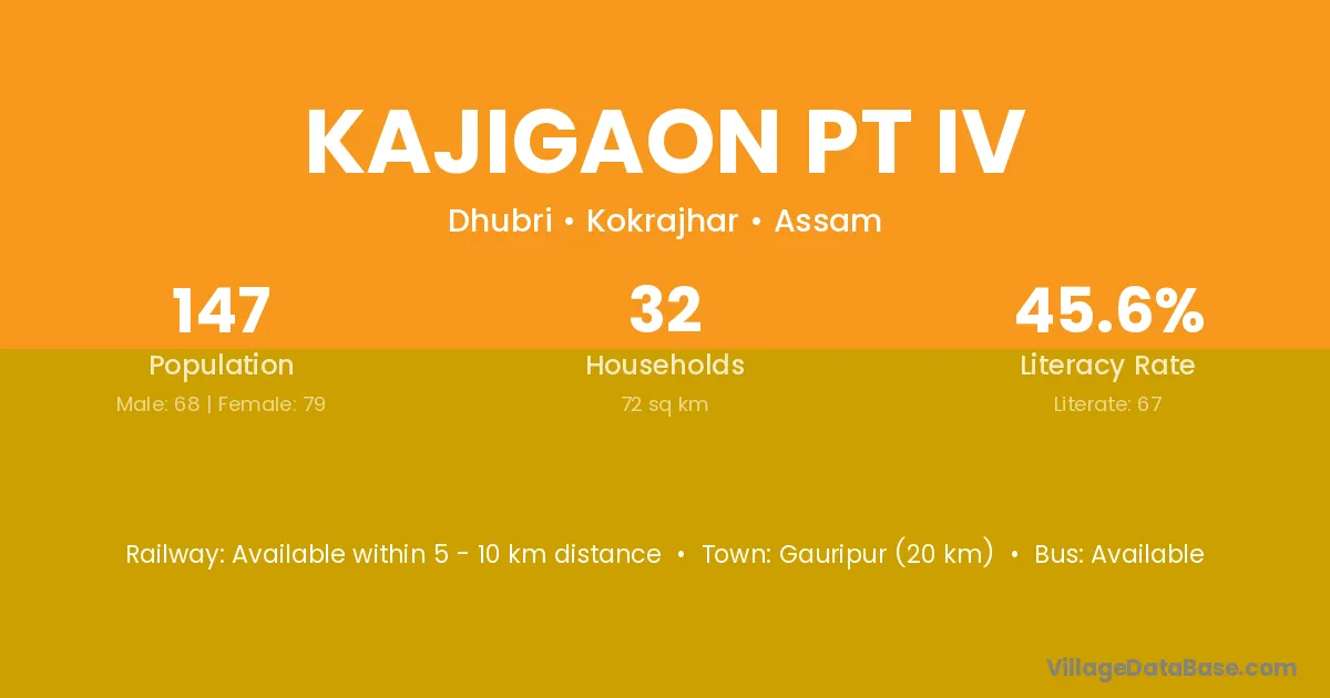 Gauripur (20 km) is the nearest town to Kajigaon Pt Iv village for major economic activities and is located approximately 20 km away.