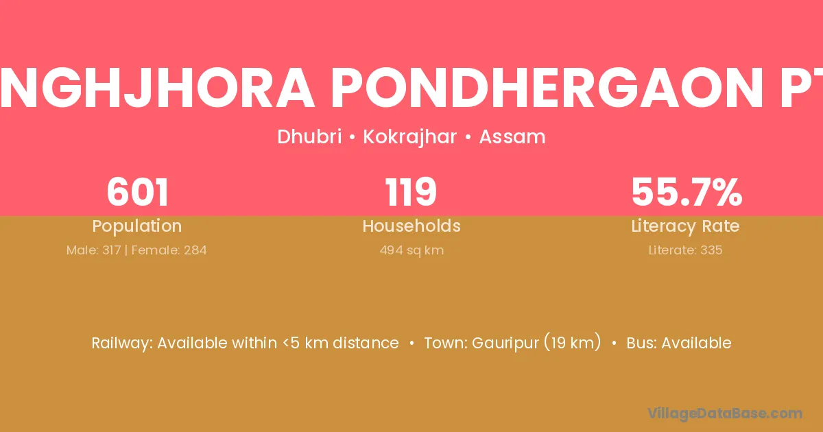 Gauripur (19 km) is the nearest town to Singhjhora Pondhergaon Pt I village for major economic activities and is located approximately 19 km away.