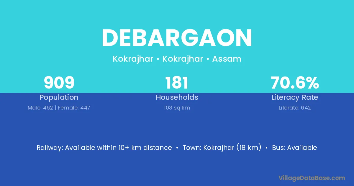 Kokrajhar (25 km) is the nearest town to Debargaon village for major economic activities and is located approximately 25 km away.