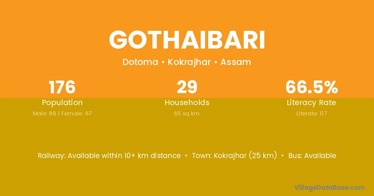 Kokrajhar (25 km) is the nearest town to Gothaibari village for major economic activities and is located approximately 25 km away.