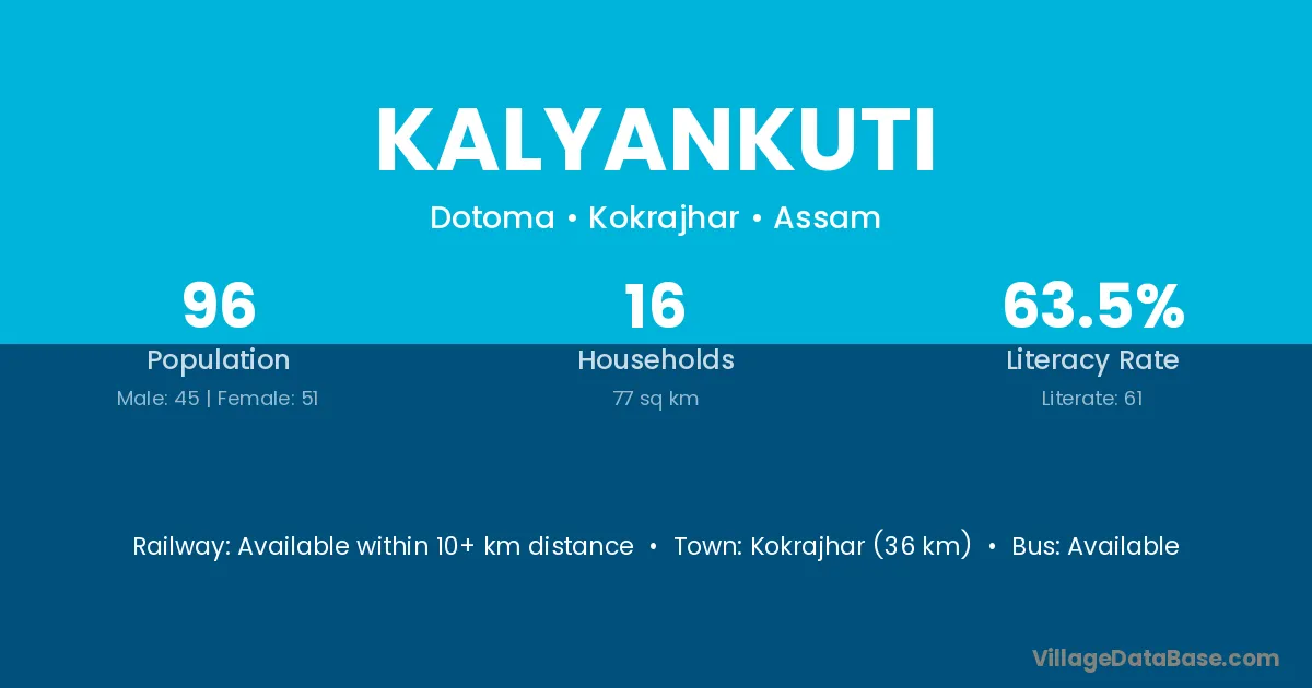 Kokrajhar (36 km) is the nearest town to Kalyankuti village for major economic activities and is located approximately 36 km away.