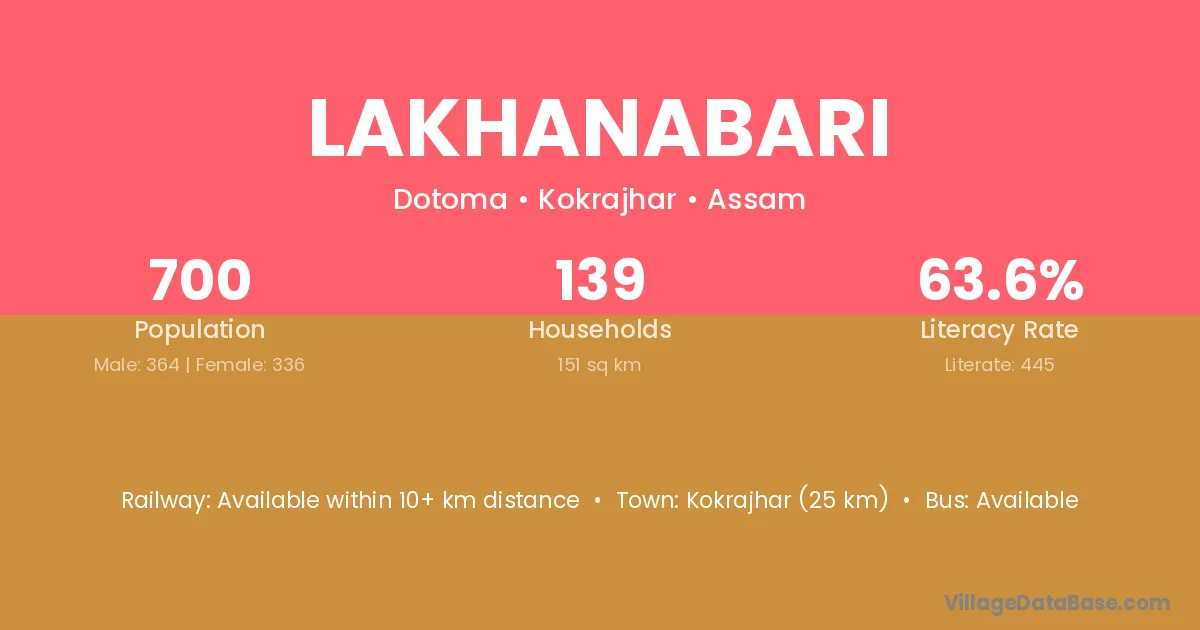 Kokrajhar (25 km) is the nearest town to Lakhanabari village for major economic activities and is located approximately 25 km away.