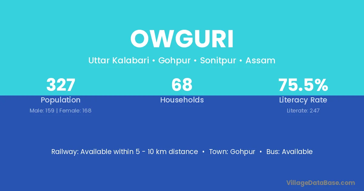 The literacy rate of Owguri village is 44.77%. Male literacy stands at 57.28% and female literacy at 33.47%.