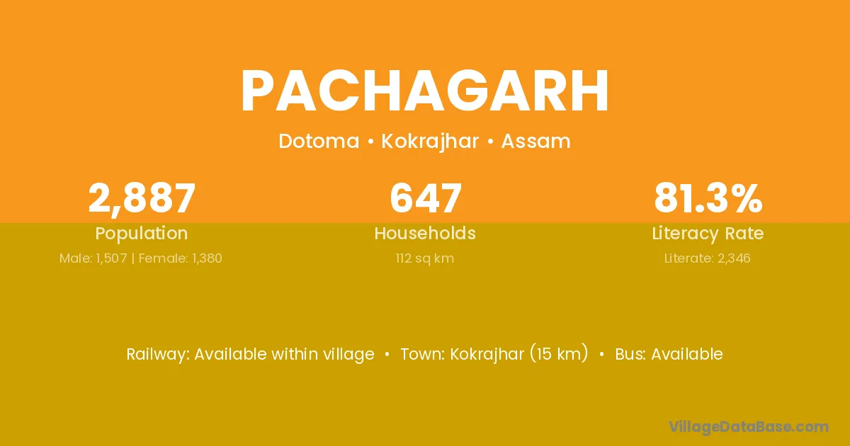 Kokrajhar (15 km) is the nearest town to Pachagarh village for major economic activities and is located approximately 15 km away.