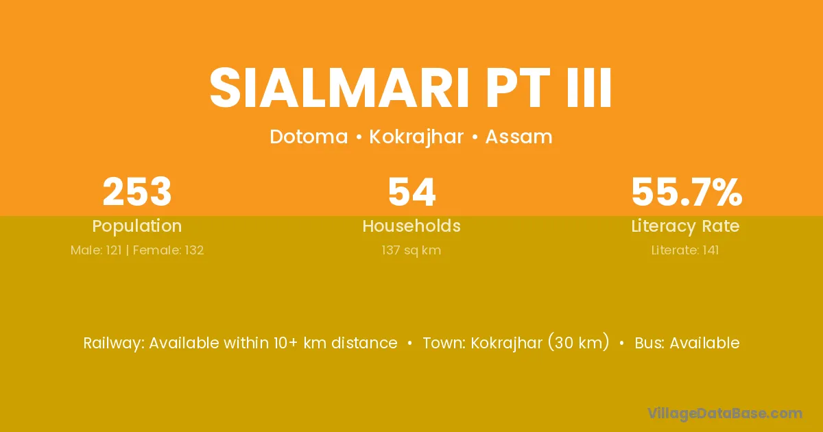 Kokrajhar (30 km) is the nearest town to Sialmari Pt Iii village for major economic activities and is located approximately 30 km away.