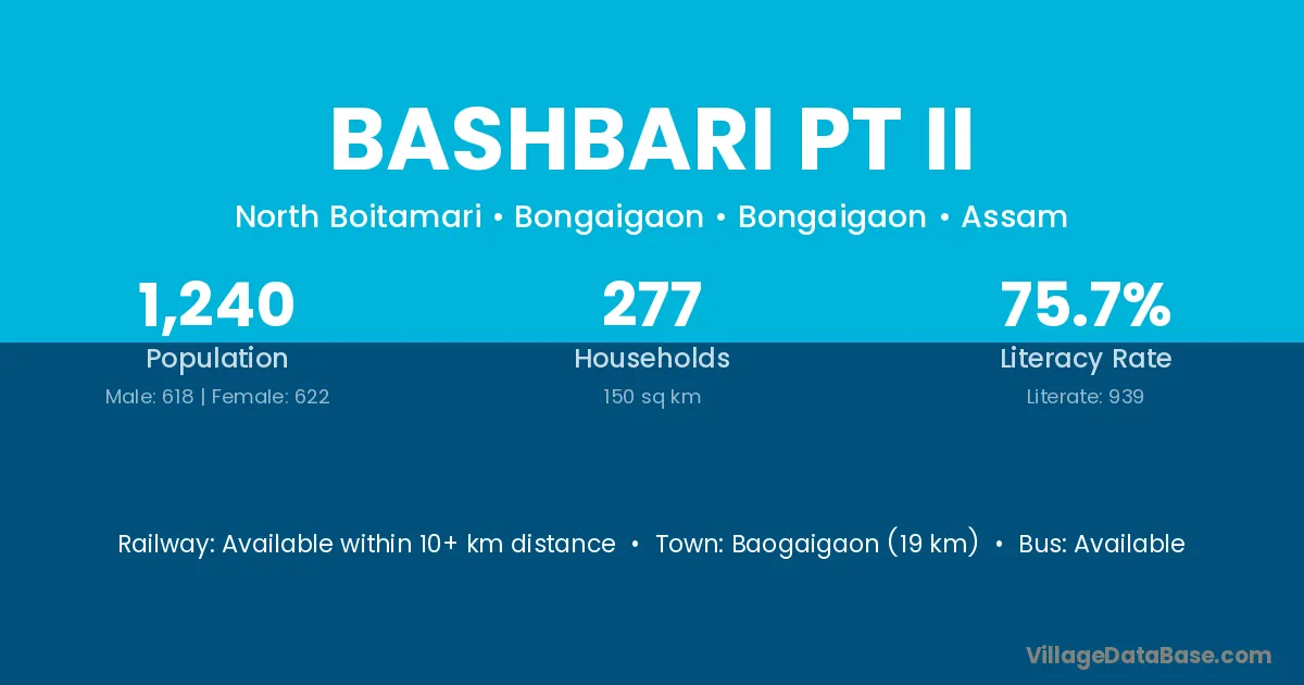 Gauripur (16 km) is the nearest town to Bashbari Pt Ii village for major economic activities and is located approximately 16 km away.