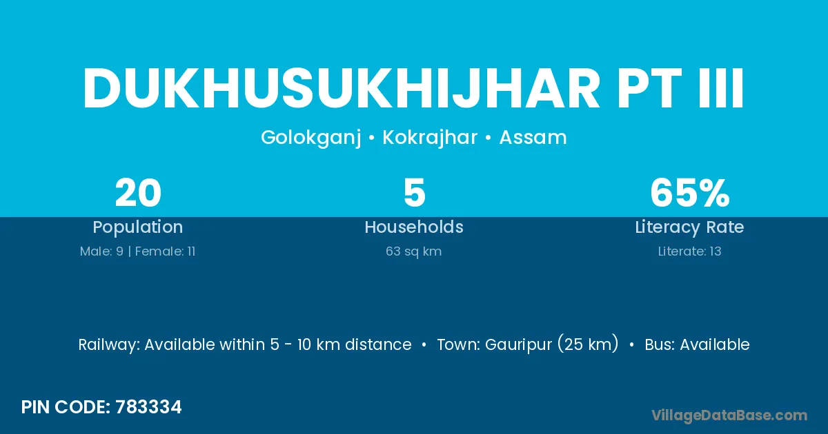 Gauripur (25 km) is the nearest town to Dukhusukhijhar Pt Iii village for major economic activities and is located approximately 25 km away.