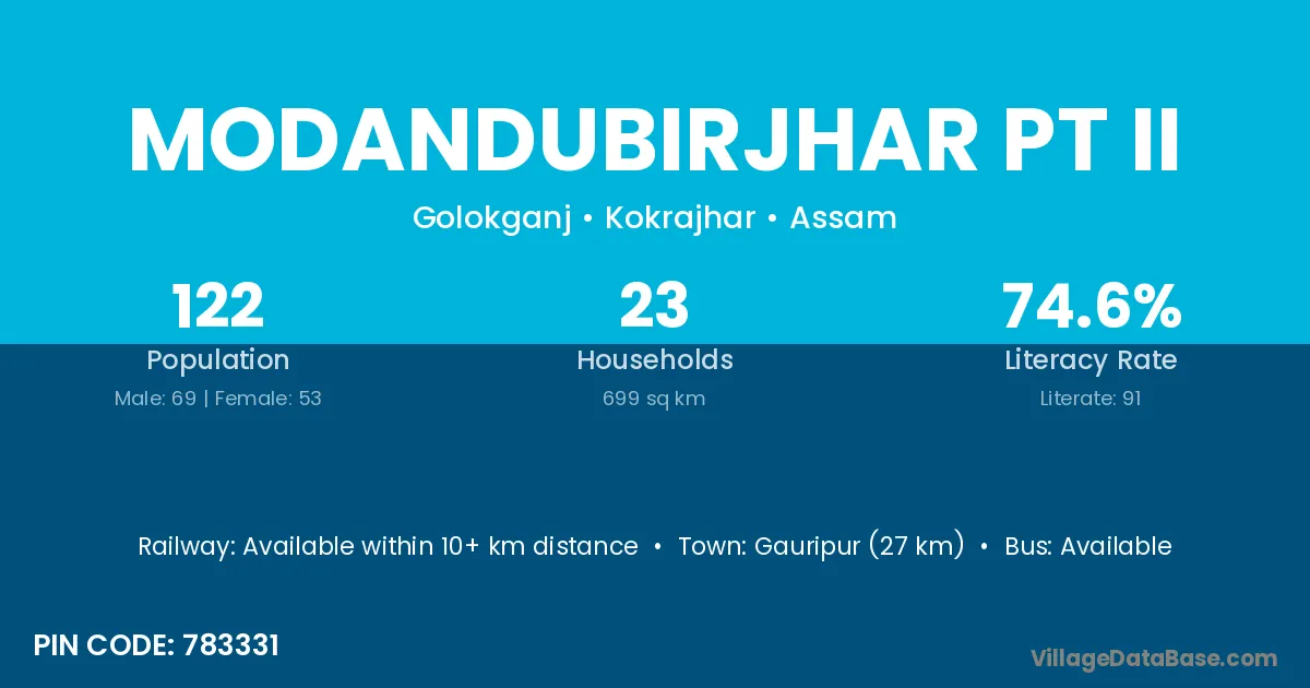 Modandubirjhar Pt Ii village has a total population of 122 people, of which 69 are males and 53 are females.