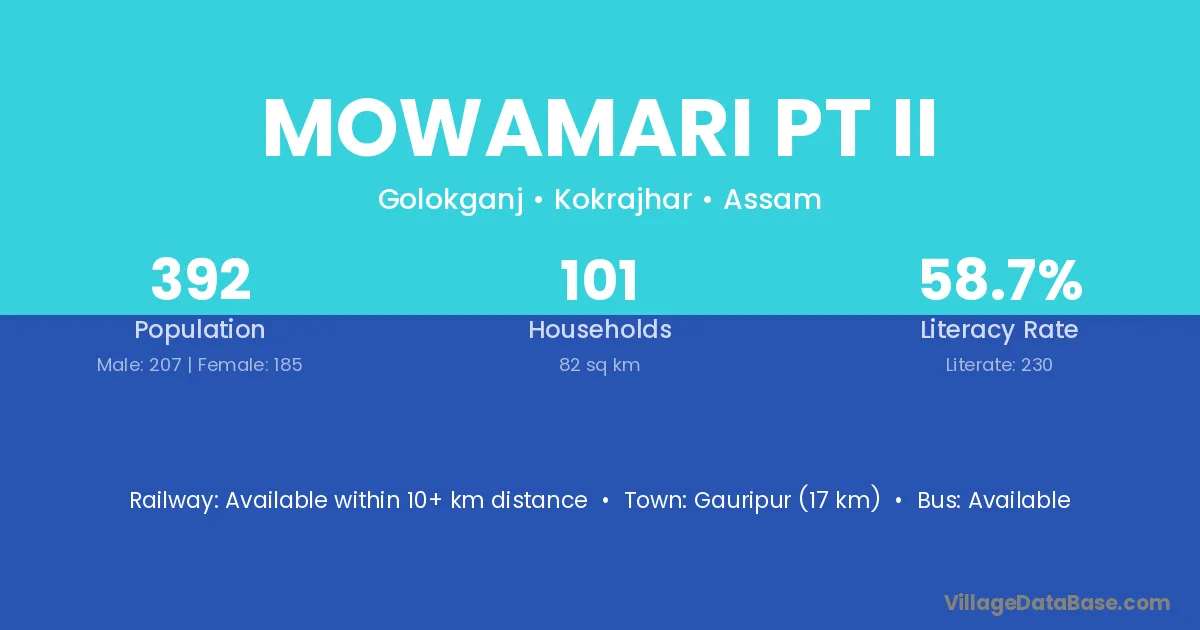 Gauripur (17 km) is the nearest town to Mowamari Pt Ii village for major economic activities and is located approximately 17 km away.