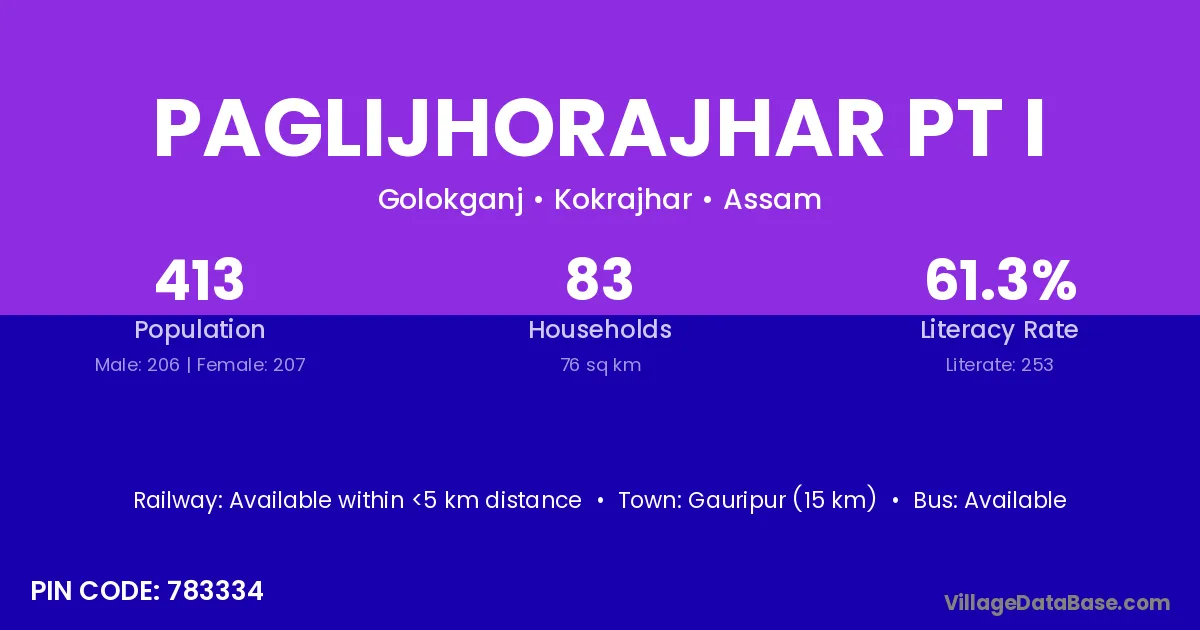 Paglijhorajhar Pt I village has a total population of 413 people, of which 206 are males and 207 are females.