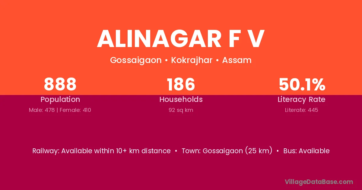 Gossaigaon (25 km) is the nearest town to Alinagar F V village for major economic activities and is located approximately 25 km away.