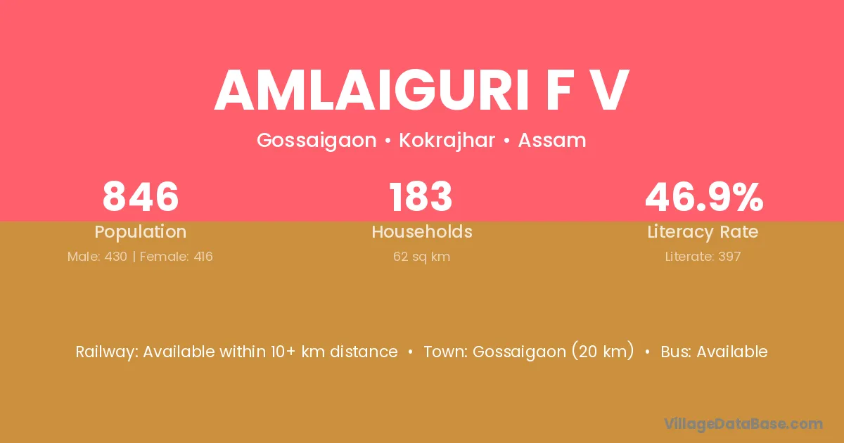 Gossaigaon (20 km) is the nearest town to Amlaiguri F V village for major economic activities and is located approximately 20 km away.