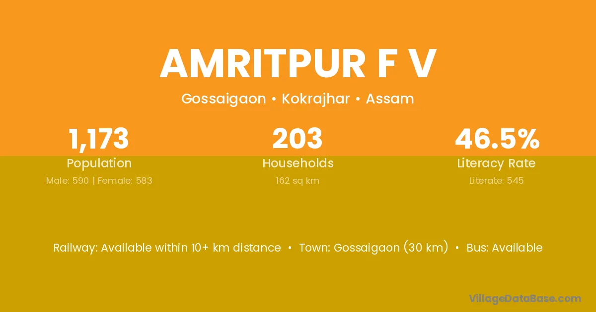 Gossaigaon (30 km) is the nearest town to Amritpur F V village for major economic activities and is located approximately 30 km away.