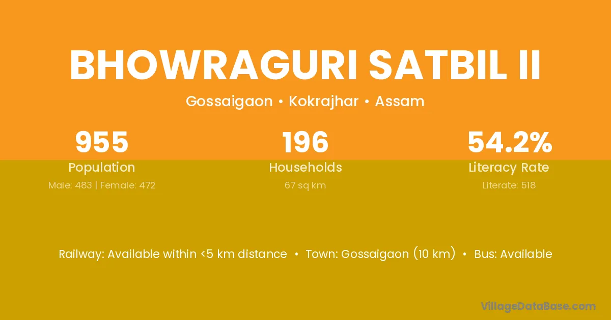 Bhowraguri Satbil Ii village has a total population of 955 people, of which 483 are males and 472 are females.