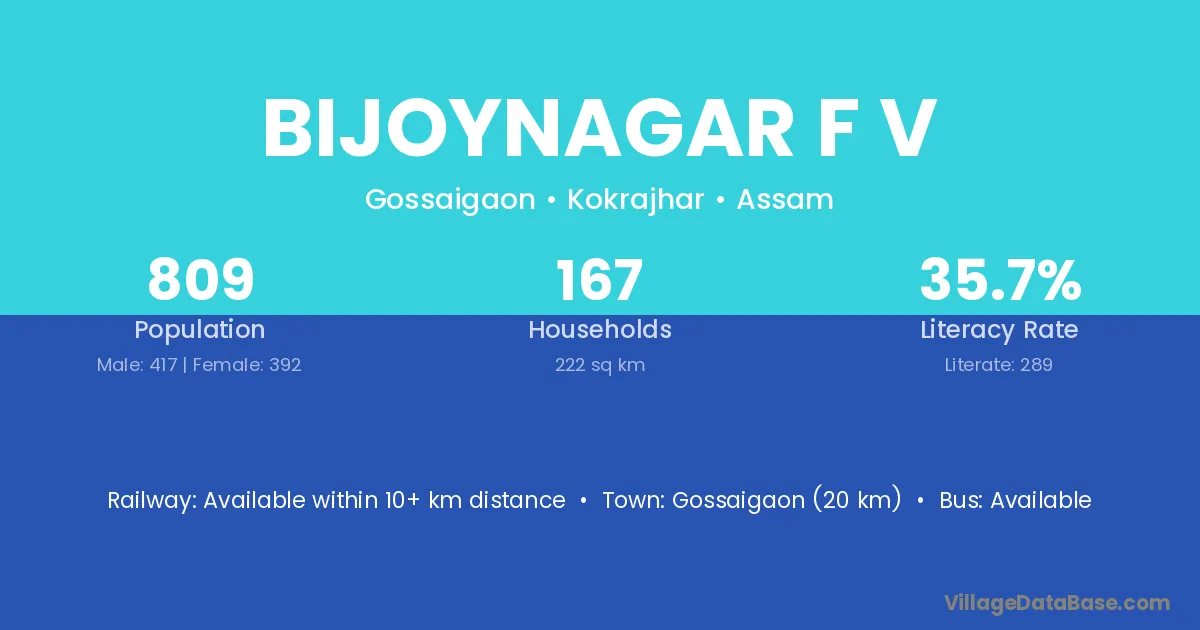 Gossaigaon (20 km) is the nearest town to Bijoynagar F V village for major economic activities and is located approximately 20 km away.