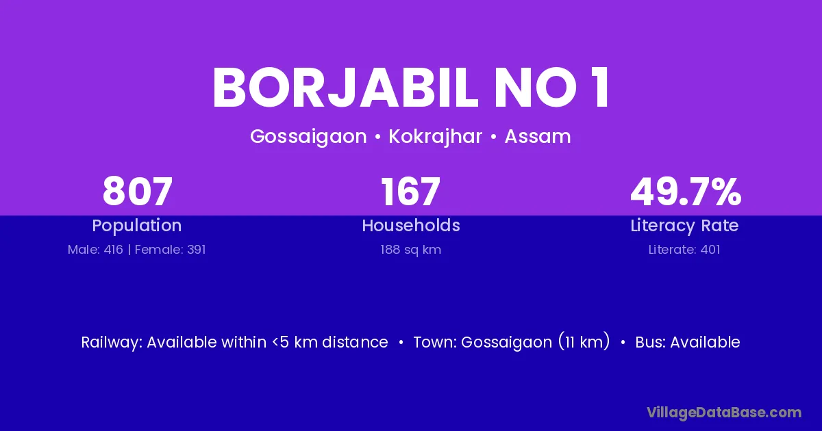 Gossaigaon (11 km) is the nearest town to Borjabil No 1 village for major economic activities and is located approximately 11 km away.
