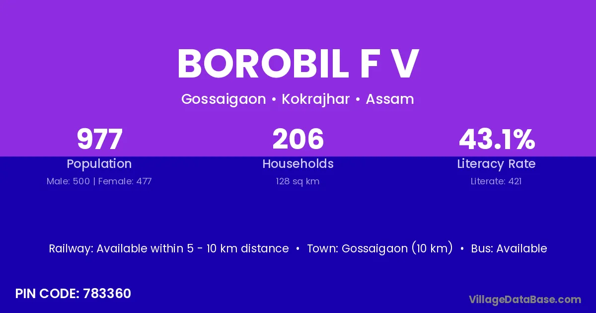 Gossaigaon (10 km) is the nearest town to Borobil F V village for major economic activities and is located approximately 10 km away.