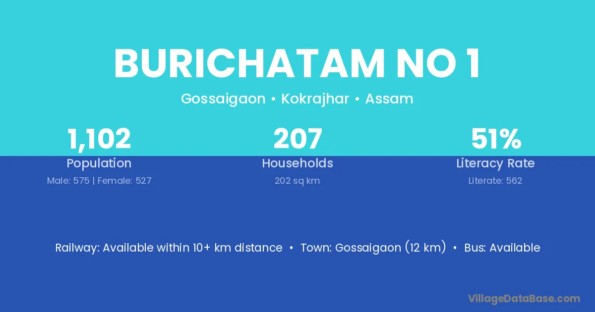 Gossaigaon (12 km) is the nearest town to Burichatam No 1 village for major economic activities and is located approximately 12 km away.