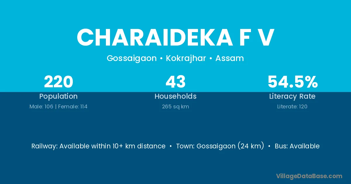 Gossaigaon (24 km) is the nearest town to Charaideka F V village for major economic activities and is located approximately 24 km away.