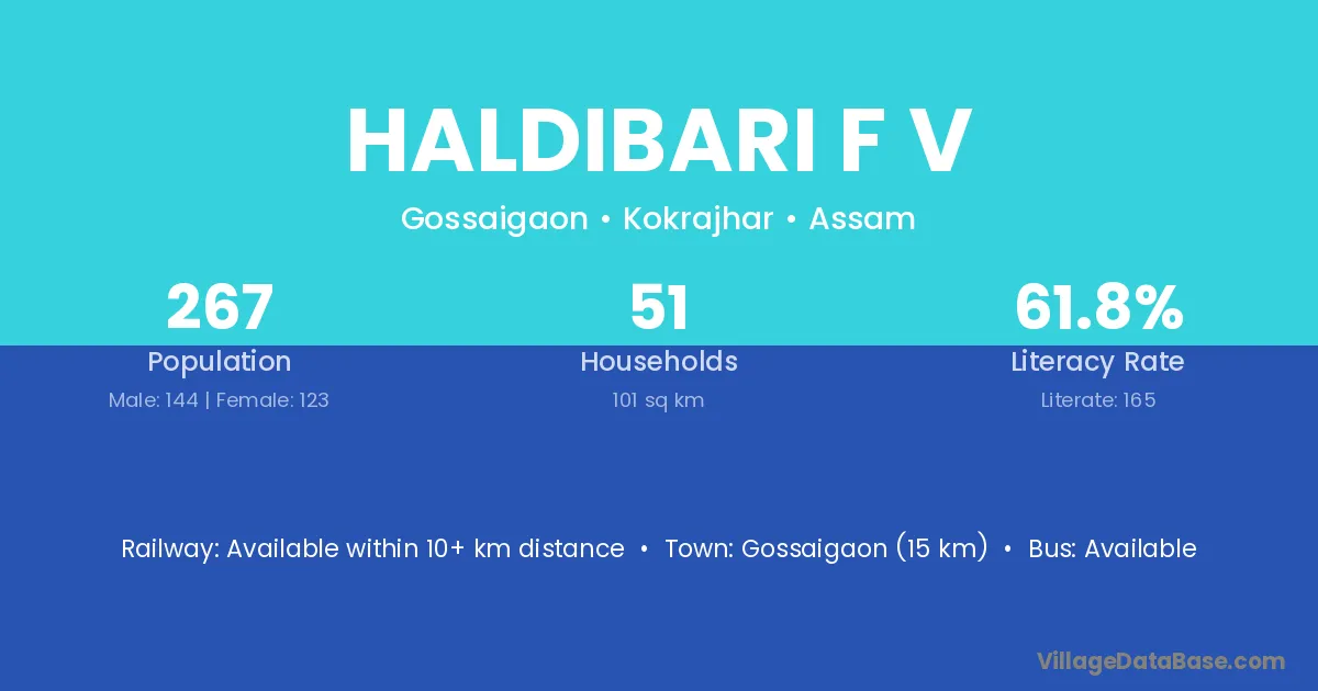 Haldibari F V village has a total population of 267 people, of which 144 are males and 123 are females.