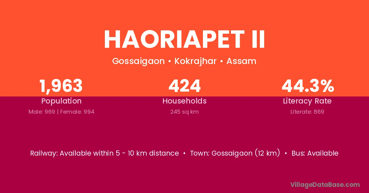 Gossaigaon (12 km) is the nearest town to Haoriapet Ii village for major economic activities and is located approximately 12 km away.