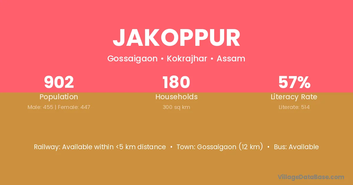 Gossaigaon (12 km) is the nearest town to Jakoppur village for major economic activities and is located approximately 12 km away.