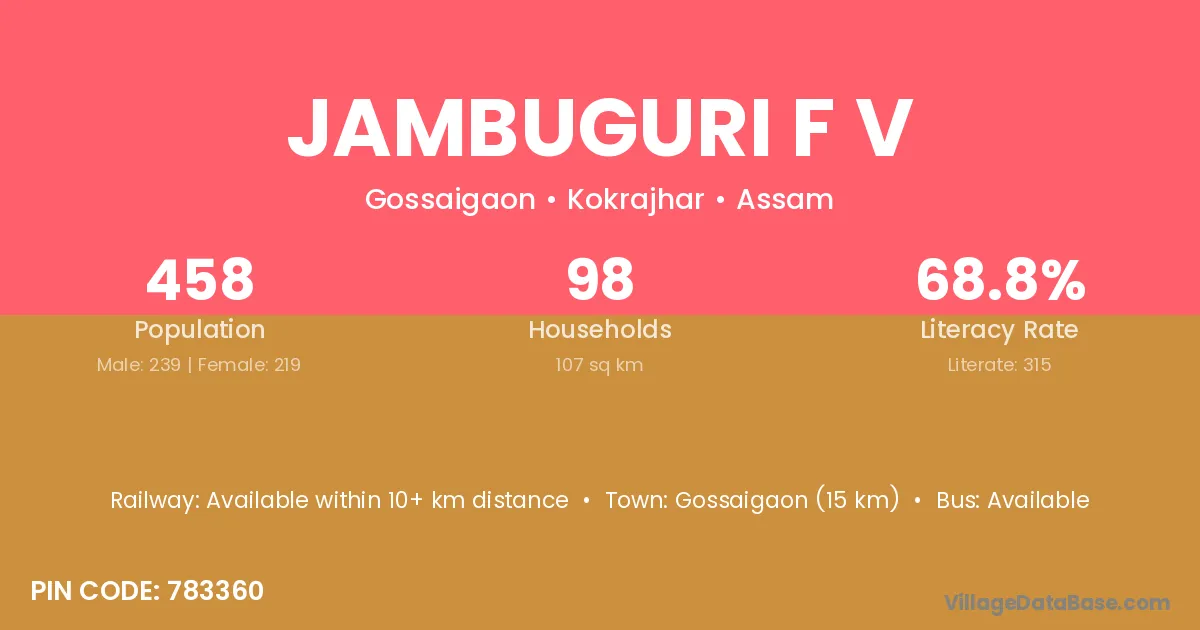 Jambuguri F V village has a total population of 458 people, of which 239 are males and 219 are females.