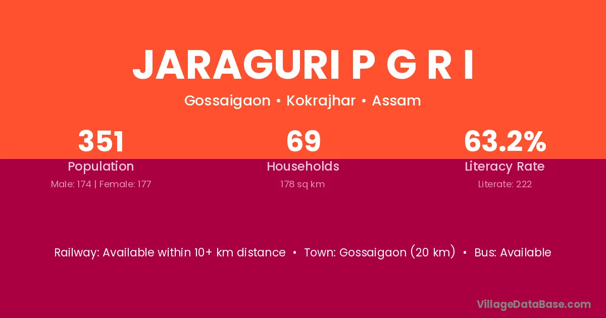 Gossaigaon (20 km) is the nearest town to Jaraguri P G R I village for major economic activities and is located approximately 20 km away.