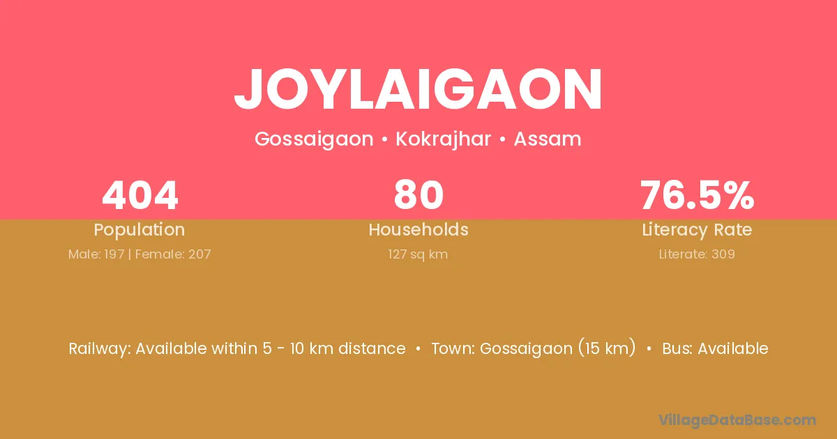 Gossaigaon (15 km) is the nearest town to Joylaigaon village for major economic activities and is located approximately 15 km away.