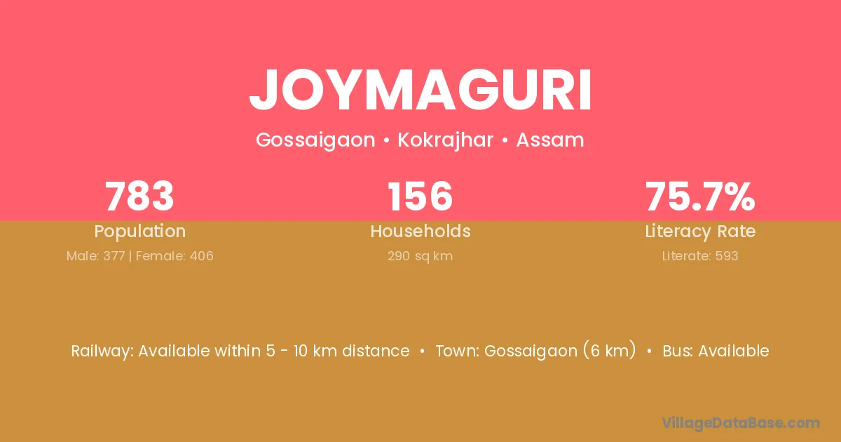 Gossaigaon (6 km) is the nearest town to Joymaguri village for major economic activities and is located approximately 6 km away.