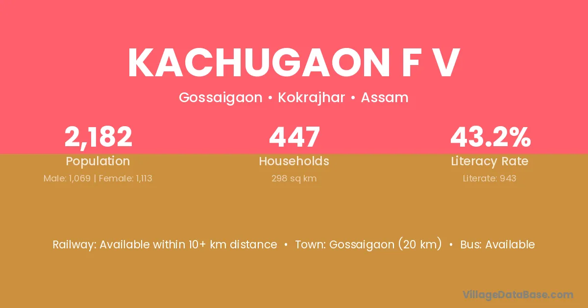 Kachugaon F V village has a total population of 2,182 people, of which 1,069 are males and 1,113 are females.