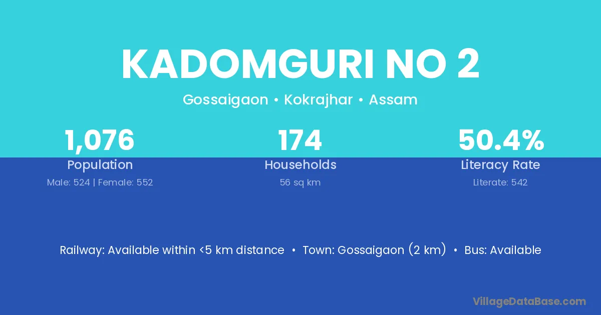 Gossaigaon (2 km) is the nearest town to Kadomguri No 2 village for major economic activities and is located approximately 2 km away.