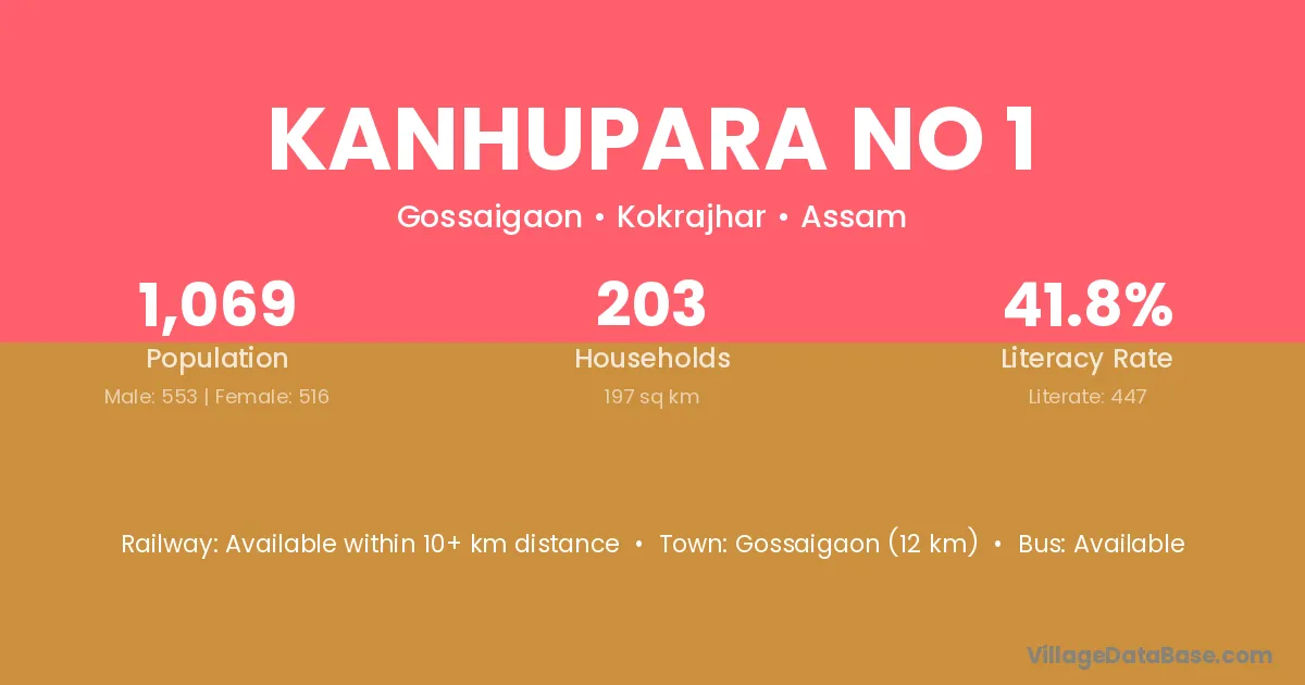 Gossaigaon (12 km) is the nearest town to Kanhupara No 1 village for major economic activities and is located approximately 12 km away.